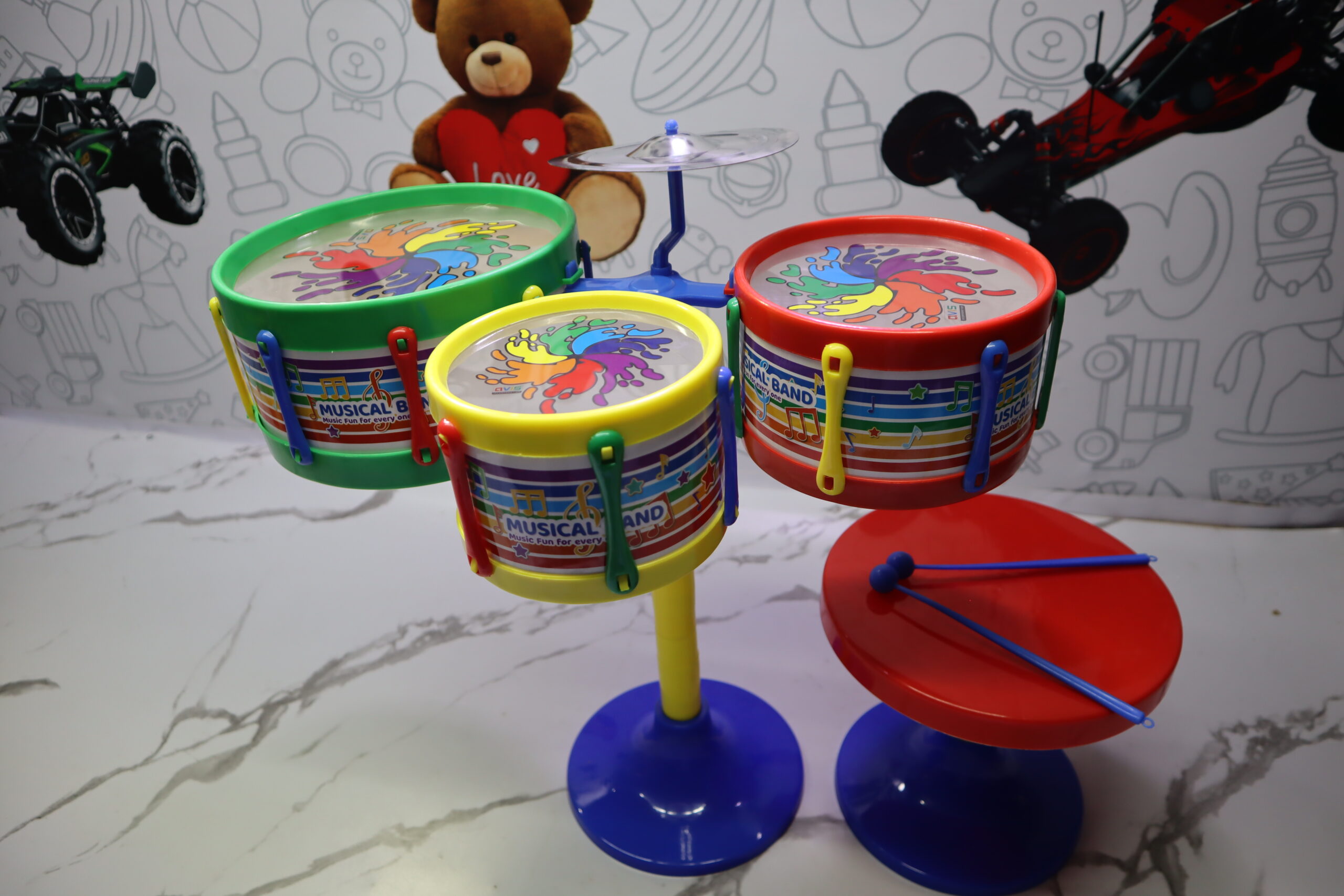 Get your little rockstar ready for center stage with the Avis Jazz Drum Set with Stool – a complete mini drum kit designed for young musicians to explore rhythm, coordination, and musical creativity. With a vibrant rock-themed design and a matching stool included, this set delivers the full band experience at home!