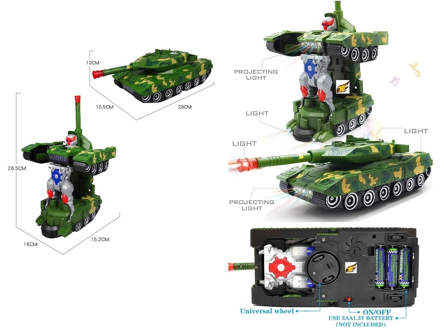 - Automatic Deformation Combat Tank (Battery Operated) 2-In-1 tank to robot and again robot to tank with bright lights and music.
